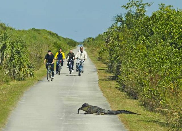 En route vers le Parc des Everglades. Depuis l’Ernest Coe Visitor Center, plusieurs trails s'offrent à vous : l'Anhinga Trail, une boucle de 6km environ, peuplée d’alligators, de tortues, loutres, de hérons bleus, d’aigrettes et bien d'autres espèces encore. Plus long, le Long Pines Key Trail (11 km) est un réseau de sentiers qui serpentent à travers les les pins peuplés de piverts. Depuis le Flamingo Visitor Center, vous pourrez découvrir Christian Point (traversée de la mangrove puis de la prairie côtière) ou Snake Bright (la baie au serpent). Vous pourrez aussi opter pour une excursion en bateau ou en canoë (plutôt au départ du Gulf Coast Visitor center). Arrêt obligatoire au Miccosukee Cultural Center, à l’ouest du Shark Valley Visitor Center).