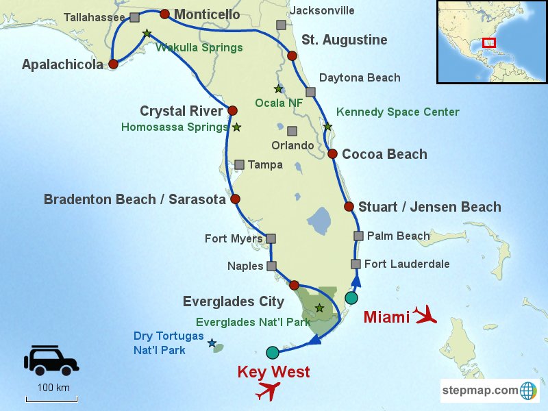 Route vers Key West, point le plus méridional des Etats-Unis. Vous traverserez l'archipel des Keys par l'Overseas Highway, qui enjambe 42 ponts ! Parmi les possibilités de halte au long de cette magnifique route, Key Largo, la plus grande des Keys, est réputée pour ses spots de plongée. Un peu plus loin, Islamorada, s'est autoproclamée 'capitale mondiale de la pêche au gros'.