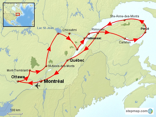 Vous vous dirigez vers Gaspé, où vous pourrez visiter rapidement le Parc national Forillon. Ensuite, vous empruntez la très belle route panoramique le long du St-Laurent, jusqu'à Ste-Anne-des-Monts.
