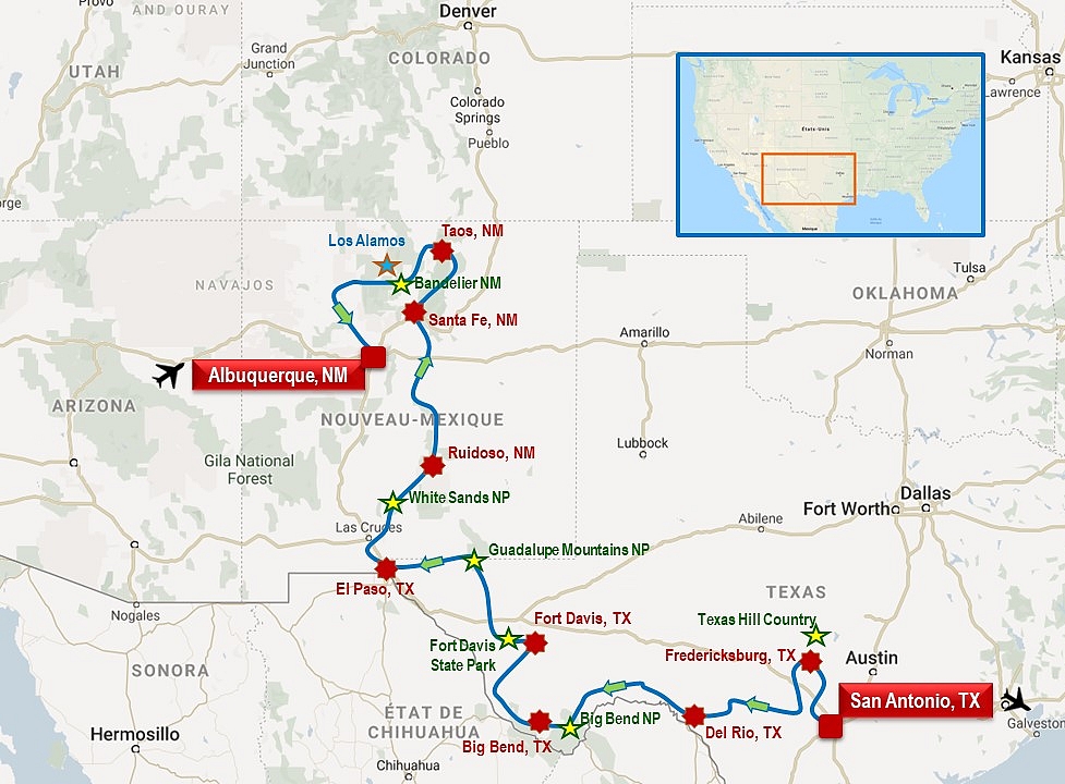 Au départ de San Antonio, un superbe périple sur les traces d'un autre ouest, entre corrals, Rio Grande, pueblos, vignobles et presidios. Après le Texas Hill Country, le parc de Big Bend et El Paso, aux confins du Mexique, cap sur les pueblos du Nouveau-Mexique, via Santa Fe et Taos, avant de redescendre vers Los Alamos, les habitations troglodytiques de Bandelier, puis Albuquerque, la fin du périple. Possibilité d'extension de séjour en ranch près de Tucson en Arizona (liaison en voiture ou en avion).