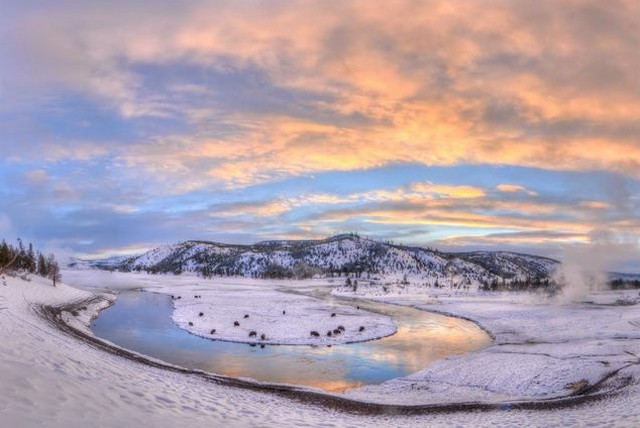 Balade parmi les geysers actifs et autres manifestations géothermiques improbables, en attendant l'éruption du célèbre Old Faithful, qui se répète toutes les 90 minutes environ depuis de très longues années... Nous apercevrons sans doute les bisons recouverts de givre, les wapitis et les pygargues à tète blanche.