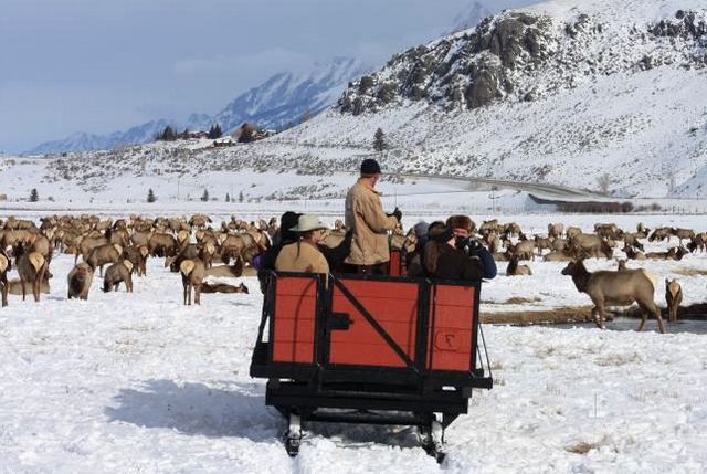 Nous ferons ensuite une promenade en traîneau guidée par un garde-forestier à travers le pâturage hivernal de 7.000 wapitis.