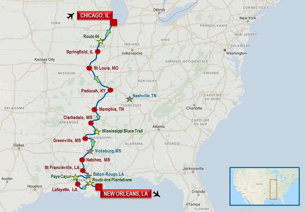 Quand partir ? Cet itinéraire peut être effectué toute l'année, même si nous déconseillons les mois d'hiver, surtout pour la partie nord du tracé, entre Memphis et Chicago, pour éviter des températures trop froides et d'éventuelles chutes de neige. Un tracé alternatif peut être envisagé, avec dans ce cas un retour depuis Memphis ou Nashville, ou un vol intérieur entre Memphis ou Nashville, suivi d'une extension de séjour sur Chicago, par exemple. Inversement, en août, septembre et octobre, la chaleur peut être très humide dans la partie sud du tracé, entre New Orleans & Memphis. Mais ce ne sont que des tendances, parfois contredites sur le terrain. Nous consulter pour toute question à ce sujet !
